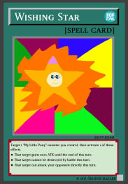 DOTV-EN041: Wishing Star Normal Spell Target 1 "My Little Pony" monster you control, then activate 1 of these effects. ● That target gains 1000 ATK until the end of this turn. ● That target cannot be destroyed by battle this turn. ● That target can attack your opponent directly this turn. Common |