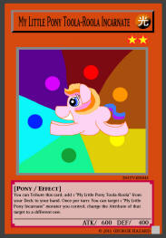 DOTV-EN043: My Little Pony Toola-Roola Incarnate LIGHT / Pony / Level 2 / ATK 600 / DEF 400 You can Tribute this card; add 1 "My Little Pony Toola-Roola" from your Deck to your hand. Once per turn: You can target 1 "My Little Pony Incarnate" monster you control; change the Attribute of that target to a different one. Common |