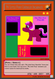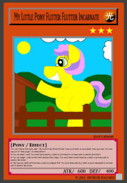 DOTV-EN049: My Little Pony Flitter Flutter Incarnate LIGHT / Pony / Level 3 / ATK 600 / DEF 400 You can Tribute this card; add 1 "My Little Pony Flitter Flutter" from your Deck to your hand. Once per turn: You can pay 300 LP, then apply 1 of these effects. ● You can draw 1 card. You must have exactly 3 cards in your hand to activate and to resolve this effect. ● You can target 1 card on the field; destroy that target. You must have control exactly 3 cards to activate and to resolve this effect. ● This face-up card's ATK become 3 times its original ATK. You must have exactly 3 cards in your Graveyard to activate and to resolve this effect. Common |