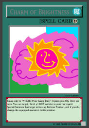 DOTV-EN047: Charm of Brightness Equip Spell Equip only to "My Little Pony Sunny Daze". It gains 700 ATK. Once per turn: You can target 1 Level 4 LIGHT monster in your Graveyard; Special Summon that target in face-up Defense Position, and if you do, change the equipped monster's battle position. Rare |