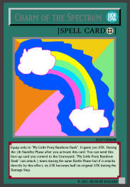 DOTV-EN048: Charm of the Spectrum Equip Spell Equip only to "My Little Pony Rainbow Dash". It gains 700 ATK. During the 7th Standby Phase after you activate this card: You can send this face-up card you control to the Graveyard; "My Little Pony Rainbow Dash" can attack 7 times during the same Battle Phase but if it attacks directly by this effect, its ATK becomes half its original ATK during the Damage Step. Rare |