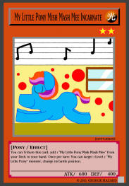 DOTV-EN050: My Little Pony Mish Mash Mee Incarnate LIGHT / Pony / Level 2 / ATK 600 / DEF 400 You can Tribute this card; add 1 "My Little Pony Mish Mash Mee" from your Deck to your hand. Once per turn: You can target 1 Level 2 "My Little Pony" monster; change its battle position. Common |