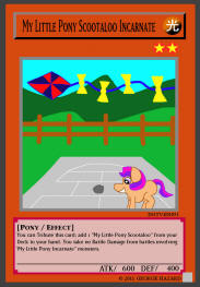DOTV-EN051: My Little Pony Scootaloo Incarnate LIGHT / Pony / Level 2 / ATK 600 / DEF 400 You can Tribute this card; add 1 "My Little Pony Scootaloo" from your Deck to your hand. You take no Battle Damage from battles involving "My Little Pony Incarnate" monsters. Common |