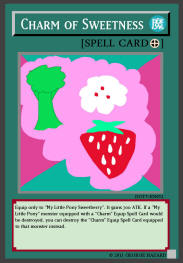 DOTV-EN052: Charm of Sweetness Equip Spell Equip only to "My Little Pony Sweetberry". It gains 700 ATK. If a "My Little Pony" monster equipped with a "Charm" Equip Spell Card would be destroyed, you can destroy the "Charm" Equip Spell Card equipped to that monster instead. Common |