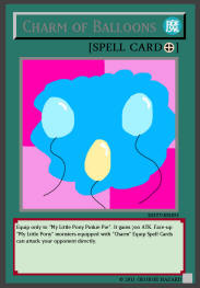 DOTV-EN053: Charm of Balloons Equip Spell Equip only to "My Little Pony Pinkie Pie". It gains 700 ATK. Face-up "My Little Pony" monsters equipped with "Charm" Equip Spell Cards can attack your opponent directly. Rare |