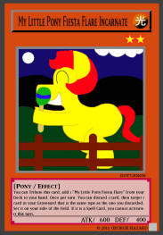 DOTV-EN056: My Little Pony Fiesta Flare Incarnate LIGHT / Pony / Level 2 / ATK 600 / DEF 400 You can Tribute this card; add 1 "My Little Pony Fiesta Flare" from your Deck to your hand. Once per turn: You can discard 1 card, then target 1 card in your Graveyard that is the same type as the one you discarded; Set it on your side of the field. If it is a Spell Card, you cannot activate it this turn. Common |