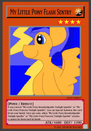 DOTV-EN057: My Little Pony Flash Sentry LIGHT / Pony / Level 4 / ATK 1600 / DEF 1200 If you control "My Little Pony Knowledgeable Twilight Sparkle" or "My Little Pony Princess Twilight Sparkle", you can Special Summon this card (from your hand). Once per turn, when "My Little Pony Knowledgeable Twilight Sparkle" or "My Little Pony Princess Twilight Sparkle" attacks, it cannot be destroyed by battle. Common |