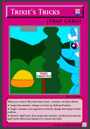 DOTV-EN058: Trixie's Tricks Normal Trap When you control "My Little Pony Trixie": Activate 1 of these effects. ● Target that monster; change it to face-up Defense Position. ● Target 1 monster your opponent controls; change that target's battle position. ● Discard 1 Spell Card, then target that monster; its effects become the Spell Card's effects but banish it if it leaves the field. Common |