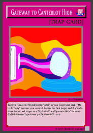 DOTV-EN059: Gateway to Canterlot High Normal Trap Target 1 "Canterlot Wondercolts Portal" in your Graveyard and 1 "My Little Pony" monster you control; banish the first target and if you do, treat the second target as a "My Little Pony Equestria Girls" monster (LIGHT/Human-Type/Level 4/ATK 1600/DEF 1200). Common |