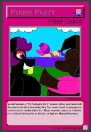RAOD-EN006: Plump Party Normal Trap Special Summon 2 "My Pudgyville Pony" monsters from your hand with the same Level; they become Level 9. You must control no monsters to activate and to resolve this effect. Those monsters cannot be Tributed for a Tribute Summon/Set or be used as Synchro Material Monsters. Rare |