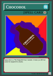 RAOD-EN007: Chocohol Equip Spell Equip only to a "My Pudgyville Pony" monster. It loses 700 DEF but cannot be targeted for attacks. Common |