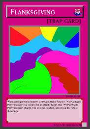 RAOD-EN010: Flanksgiving Normal Trap When an opponent's monster targets an Attack Position "My Pudgyville Pony" monster you control for an attack: Target that "My Pudgyville Pony" monster; change it to Defense Position, and if you do, negate the attack. Common |
