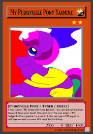 RAOD-EN012: My Pudgyville Pony Yasmine LIGHT / Pudgyville Pony-Type Tuner / Level 2 / ATK 0 / DEF 1800 If you control "My Pudgyville Pony Jasmine", you can Special Summon this card (from your hand). Once per turn: You can target 1 "My Pudgyville Pony Jasmine" you control; this card gains DEF equal to half that monster's current DEF until the End Phase. Common |