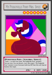 RAOD-EN013: My Pudgyville Pony Mrs. Spice LIGHT / Pudgyville Pony-Type Synchro / Level 7 / ATK 0 / DEF 2600 1 Tuner + 1 or more non-Tuner "My Pudgyville Pony" monsters Once per turn: You can discard 1 card, then target 1 "My Pudgyville Pony" monster in your Graveyard with less DEF than this card; Special Summon that target. Rare |