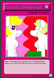 RAOD-EN014: Cousin Crossroads Normal Trap Target 1 "My Pudgyville Pony Jasmine" and 1 "My Pudgyville Pony Yasmine" you control; their DEF becomes 4000 until the End Phase. Rare |
