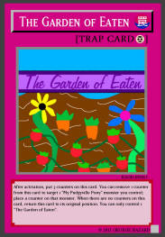 RAOD-EN015: The Garden of Eaten Continuous Trap After activation, put 3 counters on this card. You can remove 1 counter from this card to target 1 "My Pudgyville Pony" monster you control; place a counter on that monster. When there are no counters on this card, return this card to its original position. You can only control 1 "The Garden of Eaten". Common |