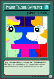 RAOD-EN018: Parent Teacher Conference Normal Spell Target 1 "My Pudgyville Pony Ms. Sheila" and 1 "My Pudgyville Pony Mrs." and/or "My Pudgyville Pony Mr." monster you control; they cannot be targeted for attacks or other card effects this turn. Common |