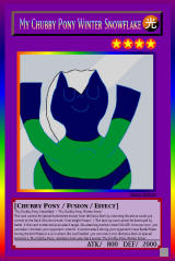 RB02-EN018: My Chubby Pony Winter Snowflake LIGHT / Chubby Pony-Type Fusion / Level 4 / ATK 800 / DEF 2000 "My Chubby Pony Snowflake" + "My Chubby Pony Winter Snow" This card cannot be Special Summoned except from the Extra Deck by returning the above cards you control to the Deck (You do not use "Overweight Fusion".). This face-up card cannot be destroyed by battle. If this card is selected as an attack target, the attacking monster loses 500 ATK. Once per turn, you can select 1 monster your opponent controls. It cannot attack during your opponent's next Battle Phase. During the End Phase of a turn where this card battled, you can return it to the Extra Deck to Special Summon 2 "My Chubby Pony" monsters from your Deck except "My Chubby Pony Winter Snow". Rainbow Rare |