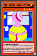 RB02-EN010: My Chubby Pony Mittens LIGHT / Chubby Pony / Level 4 / ATK 800 / DEF 2000 This face-up card cannot be destroyed by battle. If this card is selected as an attack target, the attacking monster loses 500 ATK. Face-up "My Chubby Pony" monsters gain 1000 DEF during the Damage Step when they battle Level 4 or lower monsters with more ATK than DEF. Common |