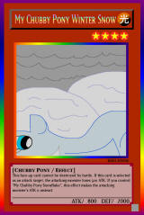 RB02-EN006: My Chubby Pony Winter Snow LIGHT / Chubby Pony / Level 4 / ATK 800 / DEF 2000 This face-up card cannot be destroyed by battle. If this card is selected as an attack target, the attacking monster loses 500 ATK. If you control "My Chubby Pony Snowflake", this effect makes the attacking monster's ATK 0 instead. Rainbow Rare |
