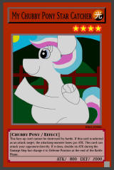 RB02-EN001: My Chubby Pony Star Catcher LIGHT / Chubby Pony / Level 4 / ATK 800 / DEF 2000 This face-up card cannot be destroyed by battle. If this card is selected as an attack target, the attacking monster loses 500 ATK. This card can attack your opponent directly. If it does, double its ATK during the Damage Step but change it to Defense Position at the end of the Battle Phase. Super Rare |