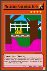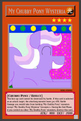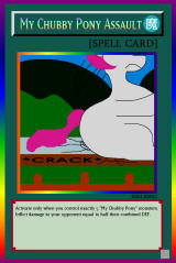 RB02-EN012: My Chubby Pony Assault Normal Spell Activate only when you control exactly 5 "My Chubby Pony" monsters. Inflict damage to your opponent equal to half their combined DEF. Rainbow Rare |