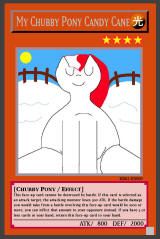 RB02-EN005: My Chubby Pony Candy Cane LIGHT / Chubby Pony / Level 4 / ATK 800 / DEF 2000 This face-up card cannot be destroyed by battle. If this card is selected as an attack target, the attacking monster loses 500 ATK. If the battle damage you would take from a battle involving this face-up card would be 1000 or more, you can inflict that amount to your opponent instead. If you have 3 or less cards in your hand, return this face-up card to your hand. Rare |