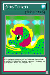 RB02-EN007: Side-Effects Normal Spell Draw 2 cards. Your opponent gains Life Points equal to the combined Level of all "My Chubby Pony" monsters you control x 400 (min 2). You cannot Summon the turn you activate this card. Common |