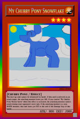 RB02-EN009: My Chubby Pony Snowflake LIGHT / Chubby Pony / Level 4 / ATK 800 / DEF 2000 This face-up card cannot be destroyed by battle. If this card is selected as an attack target, the attacking monster loses 500 ATK. If you control "My Chubby Pony Winter Snow" when this effect is activated, the attacking monster cannot attack during your opponent's next turn. If the attacking monster is a non-WATER monster, this card loses 500 ATK at the end of the Damage Step of that battle. Rainbow Rare |