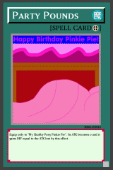 RB02-EN016: Party Pounds Equip Spell Equip only to "My Chubby Pony Pinkie Pie". Its ATK becomes 0 and it gains DEF equal to the ATK lost by this effect. Common |