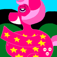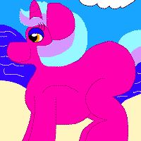 Hair: Light pink and pink Eyes: Purple Body: Fuchsia Personality: Loves doing Hollywood-type shows Fun Fact: Once a month, she allows one pony to travel with her for the week! |