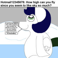 A2: I can't fly any higher than other pegasai and certainly not off this