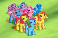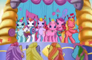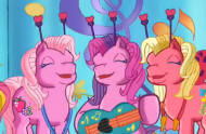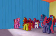 At a music stage in Ponyville, Pinkie Pie talks with a yellow pony with reddish hair named Fiesta Flare about how no one is playing together and the performance is starting soon. They need one of Pinkie Pie's squinks and Fiesta Flare explains what this is to Tink-A-Tink-A-Too. However, a ladybug lands on Pinkie Pie's nose, causing her body and squink to fall completely off-balance and down to the floor. Cotton Candy says they're up next and asks what they call themselves. The ladybug lands on Pinkie's nose again and gives Pinkie Pie an idea that makes the others giggle with delight. Cotton Candy approves and announces their cue to come on stage to perform. The group quickly put on their ladybug outfits and begin their song. Uh-oh! Where's Fiesta Flare, Bee Bop and Tink-A-Tink-A-Too? They're part of their band after all (left image) but has magically changed to Coconut Cream, Skywishes and (what looks to be) Triple Treat (right image)! |